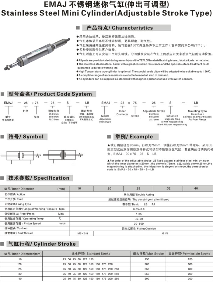 EMAJ不锈钢迷你气缸(伸出可调型) ,EASUN亿日气动不锈钢气缸管,不锈钢气缸,气动气缸,气动导向气缸,不锈钢气动角座阀迷你气缸,tpm迷你气缸